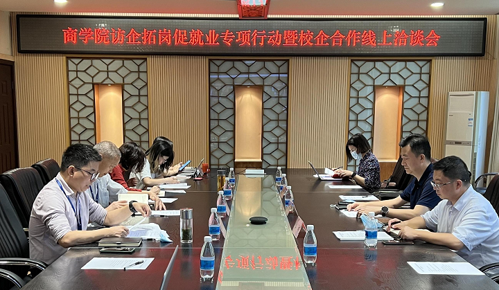 为扎实开展高校书记校长访企拓岗促就业专项行动,加强与校企合作单位的交流,全力确保2022届毕业生充分就业,商学院于5月9日上午在行政楼第三会议室召开访企拓岗促就业专项行动暨校企合作线上洽谈会,学校党委委员、副校长袁国,学校产教融合中心、就业处相关负责同志,商学院党政负责同志及各专业带头人、教研室主任等线下参会。会议由商学院副院长邱云主持。