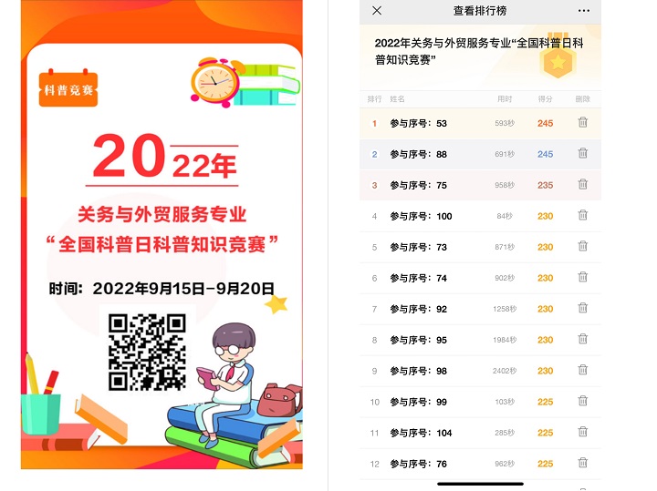 本次竞赛题型内容丰富,包括中华人民共和国科学技术普及法、卫生健康、食品安全、数字素养、国防知识、低碳生活等青年一代普遍关注的热点问题,共计50题,总分250分。138名学生积极响应,踊跃参赛,线上赛场成为了展示关务与外贸服务专业学生科学素质的大舞台。经过6天的角逐,本次竞赛最终由两名同学以245分的成绩并列冠军。