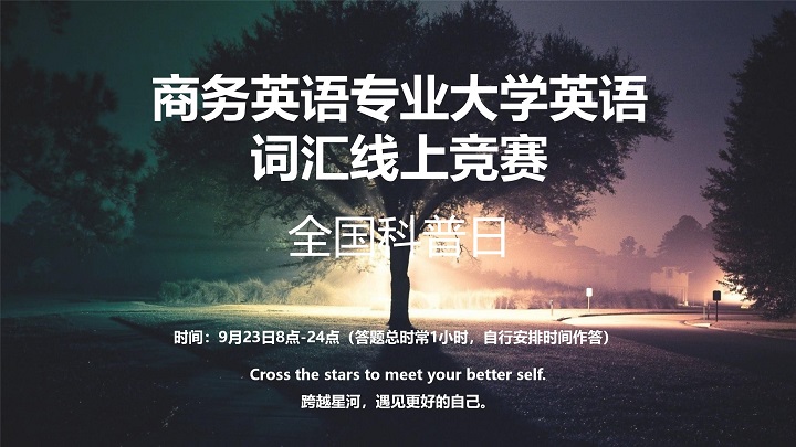 2022年9月23日,商学院商务英语教研室举办了全国科普日-商务英语专业大学英语词汇线上竞赛活动,活动主题为“Cross the stars to meet your better self”(跨越星河,遇见更好的自己)。活动参与对象囊括商务英语专业2021级、2022级学生,共186人参与。