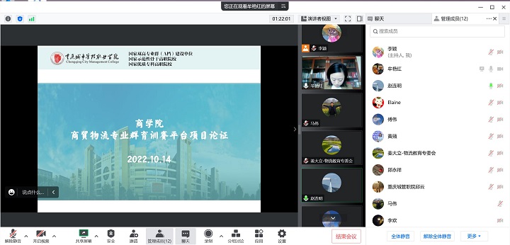 10月14日下午,商学院通过腾讯会议召开商贸物流专业群育训赛平台项目论证会。中物联应急物流专业委员会专家、重庆市国防与应急物流技术创新战略联盟秘书长姜大立,重庆商务职业学院电子商务学院副院长赵连明,重庆机电职业技术大学工商管理学院党总支书记李锐,商学院副院长邱云、牟艳红及校内专家参加了此次会议。
