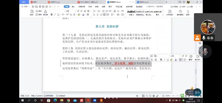 支部书记牟艳红同志诵读领学报告原文中第五部分:实施科教兴国战略,强化现代化建设人才支撑。组织学习新修订的 《中国共产党章程》。新修订的《中国共产党章程》是马克思主义中国化时代化的最新成果,体现全党意志、反映人民心愿,为全面加强党支部建设提供了理论基础和实践指引。牟艳红同志就新党章50处修改进行了重点强调,提醒师生要认真学习党纪党规,强化规矩意识,自觉严守党的纪律。进一步掌握和熟知党纪党规,增强党性观念、纪律观念。