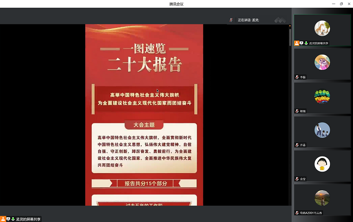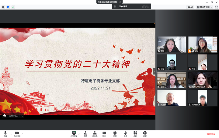 为深入学习宣传贯彻党的二十大精神,11月21日上午,跨境电子商务专业党支部召开线上支部大会,专题学习党的二十大精神。会议由党支部书记孟灵主持,支部所有教师党员和部分学生党员参加了此次学习研讨。