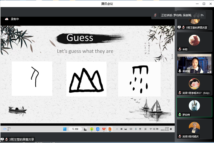 11月29日,由商学院“以文化人”大学生思想教育工作室与国际交流与合作中心联合举办的2022年中外大学生线上文化交流活动通过腾讯会议平台顺利举行。参加本次活动的有来自商学院的秦翠老师、通识教育学院的牟莉老师和文化与旅游学院的张灿老师,以及80多名中外学生。