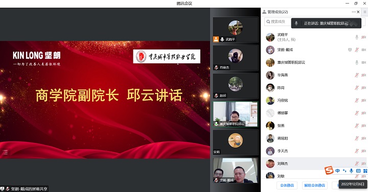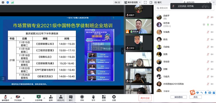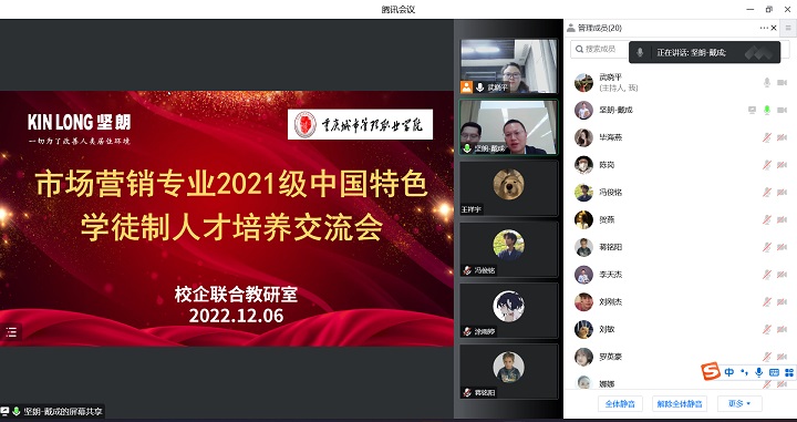 12月6日,市场营销专业2021级中国特色学徒制人才培养交流会在线上举行。商学院副院长(主持工作)邱云、校企联合教研室企业导师和校内导师及2021级坚朗营销学徒制班全体学生参加会议。