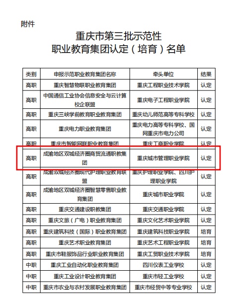 近日,重庆市教育委员会公布了重庆市第三批示范性职业教育集团认定(培育)名单,我校牵头组建的“成渝地区双城经济圈商贸流通职教集团”被成功认定为“重庆市第三批示范性职业教育集团”。