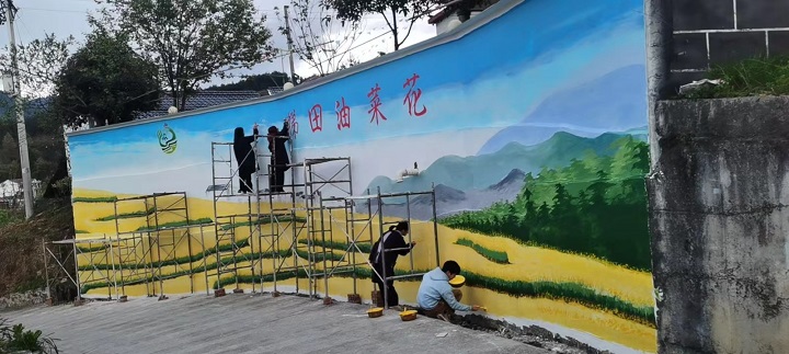 党的二十大报告指出,要统筹乡村基础设施和公共服务布局,建设宜居宜业和美乡村。为贯彻乡村振兴战略,改善人居环境,建设美丽乡村,用文创艺术赋能乡村振兴,为建设美丽乡村贡献青春力量,3月15日,重庆城市管理职业学院商学院乡村振兴墙体美化团队来到重庆市丰都县三建乡夜力坪村,开展了为期半个月的墙体美化活动。此次活动以文创和农旅相结合,通过实地调研,以多元化的文化实践方式助力乡村振兴。墙体美化团队由商学院现代物流管理专业赵建丽等7位有绘画才能的学子组成,本次活动由现代物流管理专业党支部书记宋伦斌、教师党员安小风、辅导员曾渔渔三位老师带队。