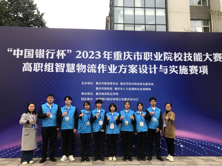 3月24日至26日,由重庆市教育委员会、重庆市经济和信息化委员会、重庆市财政局、重庆市人力资源和社会保障局等联合主办,重庆商务职业学院承办的“中国银行杯”2023年重庆市职业院校技能大赛高职组“智慧物流作业方案设计与实施”赛项成功举办。来自全市12所高职院校的24支参赛队伍同台竞技。经过三天的激烈比拼,我校商学院现代物流管理专业李怡、汤辉、向玉梅、覃思源同学组成的团队和李波、秦源、田如冰、杨斌媛同学组成的团队以第三和第四名的成绩获二等奖两项。由指导老师朱光福、彭维、秦情三位老师组成的指导教师团队全程进行指导。