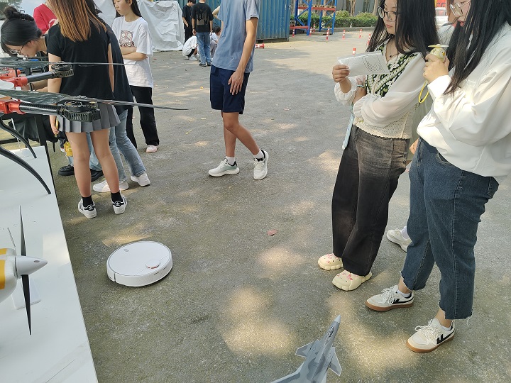 活动最后,物流机器人兴趣小组组长段海灵同学展示了扫地机器人的工作原理,组织同学们围在一起热烈探讨物流机器人在物流方面的应用。