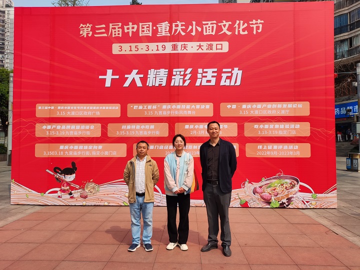 为推动重庆面工乡村振兴劳务品牌建设,3月15日,我校教师安小风、宋伦斌,学生邓慧、李青廷组成调研小组前往大渡口区参加“第三届中国·重庆小面文化节”,对我市小面品牌建设情况进行了实地调研。