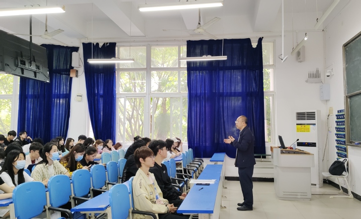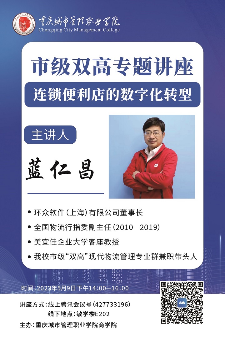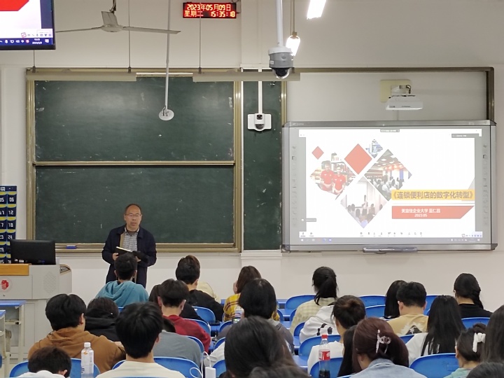 为进一步拓展学生的专业视野,了解专业发展前沿知识和技术,提高学生综合素养,商学院邀请市级双高现代物流管理专业群兼职带头人、美宜佳企业大学客座教授、教育部全国物流行职委副主任(2010-2019)蓝仁昌先生于5月9日下午在敏学楼E202多媒体教室,为物流、连锁专业学生举办了一场精彩的“连锁便利店的数字化转型”专题培训讲座。本次讲座还通过腾讯会议进行了在线直播,满足了部分不能到场听众的需求。 教育部协同创新中心现代物流应用技术推广中心主任朱光福教授,商学院专任教师彭维、孟子媛及物流创新学社全体成员,连锁经营管理与现代物流管理专业同学150余人参加了本次培训讲座。讲座由朱光福教授主持。