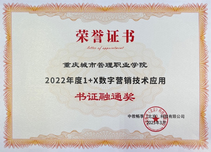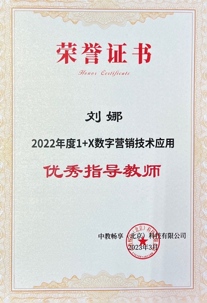3月3日,中教畅享(北京)科技有限公司召开1+X数字营销技术应用证书2022年度总结表彰大会,我校获得1+X数字营销技术应用书证融通奖,刘娜老师被评为优秀指导教师,饶亮老师获匠心育人奖。