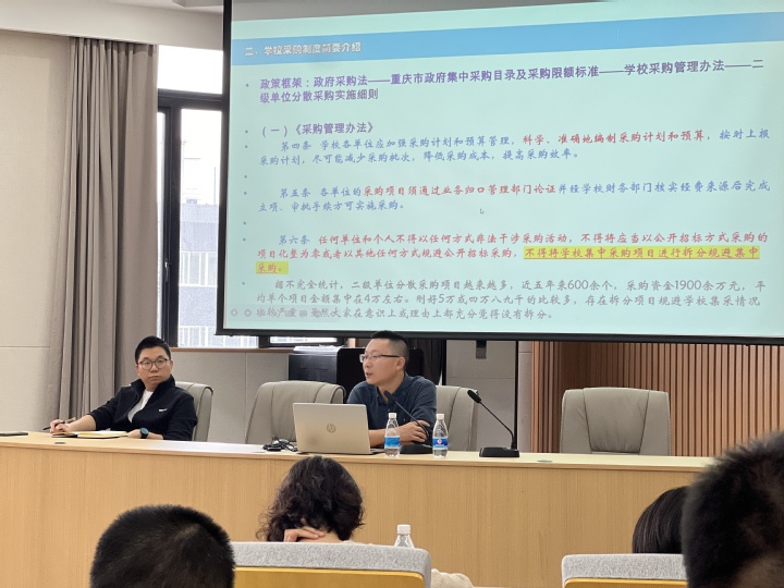 接着,汪万福领学了《政府采购法》、《二级单位分散采购实施细则》、《关于供应商违约行为处理的合同约定》、《采购工作纪律》等相关文件,并就近两年招标采购工作存在的问题进行细致分析,对招标采购规范、特别是分散采购流程、信息公开、过程记录、日常报销等方面注意事项进行了介绍和讲解。
