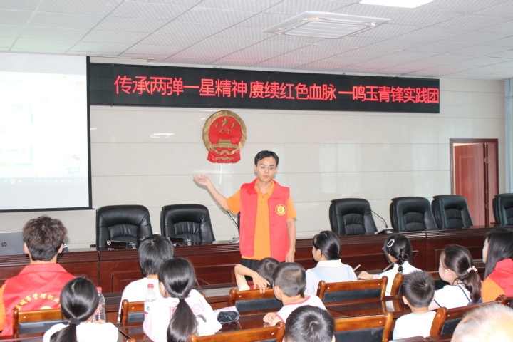 活动中,实践团成员田志鹏化身“科普讲解员”,以童趣盎然的语言和生动形象的图片,将“两弹一星”的概念转化为孩子们易于理解的比喻。他用“超级盾牌”比喻核弹的战略意义,用“太空信使”形容人造卫星的探索使命,结合钱学森、邓稼先等科学家隐姓埋名、扎根戈壁的感人事迹,深入浅出地阐释了“热爱祖国、无私奉献,自力更生、艰苦奋斗,大力协同、勇于登攀”的“两弹一星”精神内核。