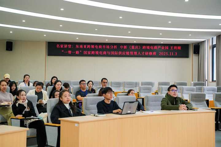 11月3日,“跨境电商丝路项目·名家讲堂”迎来第五场专业分享。中新(重庆)跨境电商产业园负责人王利刚以“东南亚跨境电商市场分析”为题,为研修班学员带来了一场紧跟行业前沿的深度讲座。