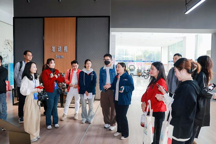 在公司总经理谭虹的引导下,学员们依次参观了摩托车总装车间、零部件生产区和跨境物流发货仓。车间负责人系统介绍了摩托车及配件从生产组装到质检入库的全过程,并重点演示了针对跨境订单的定制化生产环节。在跨境发货仓,学员们实地了解了货物报关材料准备、批次分类与打包等关键操作,对企业“自产自销+自主报关”的跨境运营模式形成了直观认识。