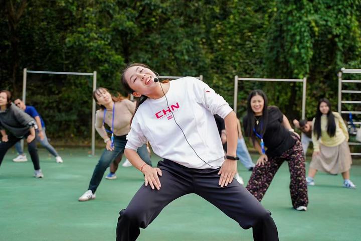 健身气功·八段锦练习场上,学员跟随孔琳琳老师一同演练“两手托天理三焦”“左右开弓似射雕”等经典动作,在一招一式中体会中国传统养生文化“形神共养、动静结合”的哲学理念。