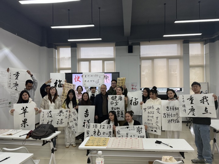 书法教室内,学员在杨汉瑜老师的带领下,从横竖撇捺基础笔画起步,专注书写“中老友好”等作品。通过笔墨纸砚的接触,他们亲身感受汉字的结构之美与书法艺术的凝神静气之功。