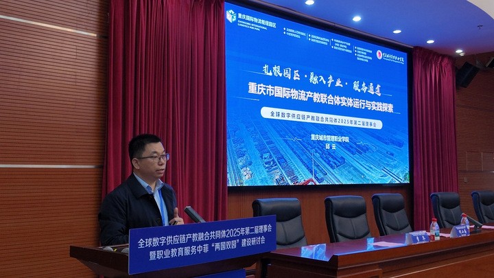 邱云以“重庆市国际物流产教联合体实体化运行与建设探索”为题作了交流发言。他系统介绍了我校现代物流管理专业群通过打造产教联合体,积极服务西部陆海新通道国家战略,深度融入重庆市内陆开放综合枢纽建设的实践,重点分享了学校在建设市域产教联合体赋能“渝车出海”等国际物流业务中的创新举措与阶段性成果,展示了我校专业群建设紧密对接区域经济发展与国家开放战略的鲜明特色。