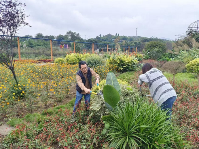 本次活动为期两天,在园林工程技术专业教师何会流以及重庆市园林行业协会副会长谢德炳总经理的指导下,2023级和2024级的部分学生以分组形式开展了土壤勘测、植物选型、现场放线、灌木修剪、杂草拔除等工作。通过现场实际操作,同学们不仅掌握了花境搭配技巧,更深入理解了植物生长习性与景观美学之间的平衡法则。