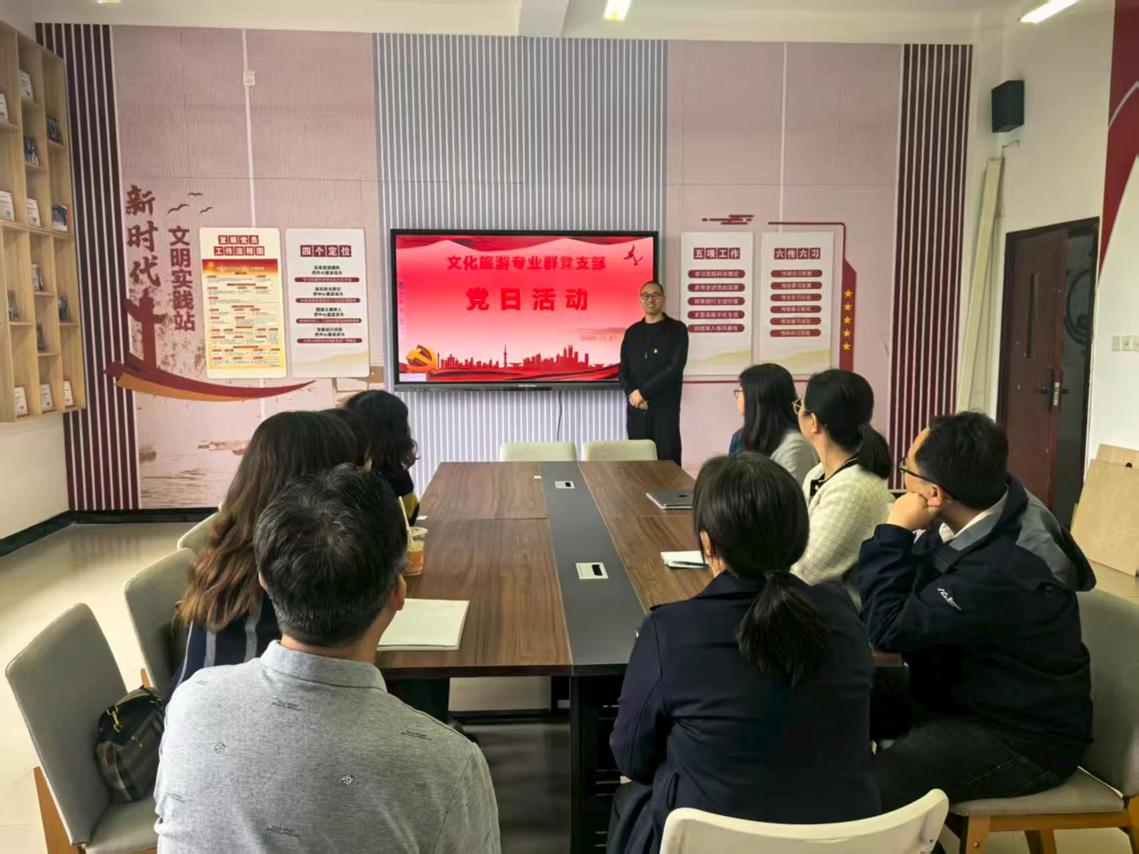 党日活动中,徐老师首先传达2025年世界职业院校技能大赛最新赛事精神。本次大赛以“技炫青春 能创未来”为核心主题,旅游赛道全面覆盖住宿业、娱乐业、商业服务业等文旅全产业链,高职组重点围绕产品开发与设计、旅游接待服务等四大类核心岗位能力设置考核内容,对参赛选手的专业技能熟练度、创新创意能力及团队协作水平提出全方位、高标准要求,为备赛工作明确方向指引。