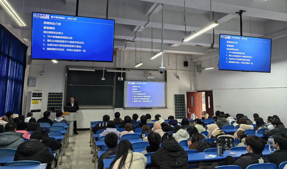 同日,文化与旅游学院举办了2023级建筑室内设计专业专场招聘宣讲会,1092023级同学参与其中,教研室主任张瀚老师出席并给予指导。活动邀请了重庆唐卡装饰工程集团有限公司与重庆乐尚装饰工程有限公司的相关负责人到场。招聘会上,两家公司负责人介绍了企业概况、招聘岗位、晋升通道以及职业发展规划等内容。在交流互动环节,企业代表耐心解答同学们的疑问,并鼓励学生积极投身实习。现场气氛热烈,有意向的同学纷纷添加了公司招聘微信群。后续,公司将按照流程安排学生进行面试和实习。此次招聘会让应届毕业生深入了解了公司情况,清晰认识了就业形势,学习到了面试技巧,获得了同学们的一致好评。