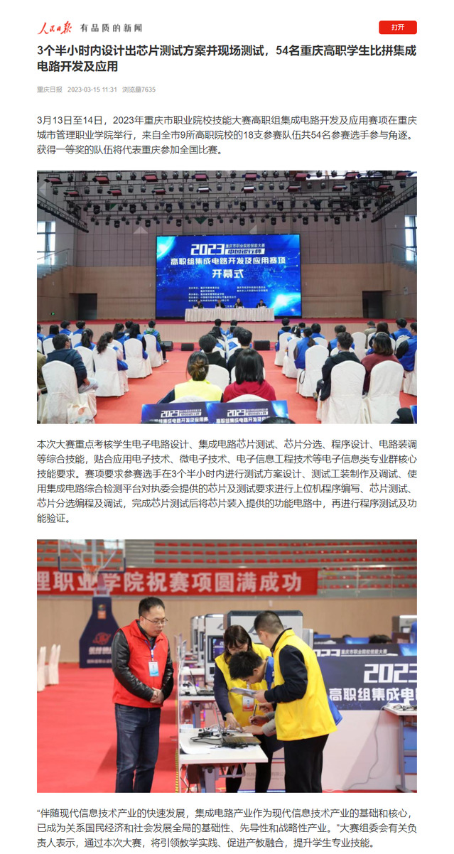 [人民日报]3个半小时内设计出芯片测试方案并现场测试,54名重庆高职学生比拼集成电路开发及应用