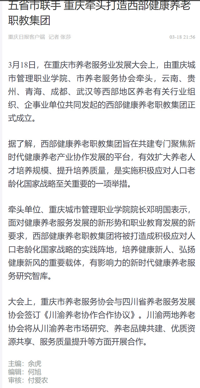 [重庆日报]五省市联手 重庆牵头打造西部健康养老职教集团