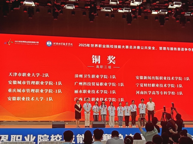 8月25日—29日,2025年世界职业院校技能大赛总决赛公共安全、管理与服务赛道争夺赛在河南经贸职业学院举行。来自全国30个省(自治区、直辖市)的177支职业院校代表队参赛,同场比拼职业技能,诠释工匠精神。我校代表队邓涵思、汪璐姣、徐诗博、柯思宇4位同学,凭借扎实的专业功底、默契的团队协作与稳定的心理素质,获得该赛项铜奖。
