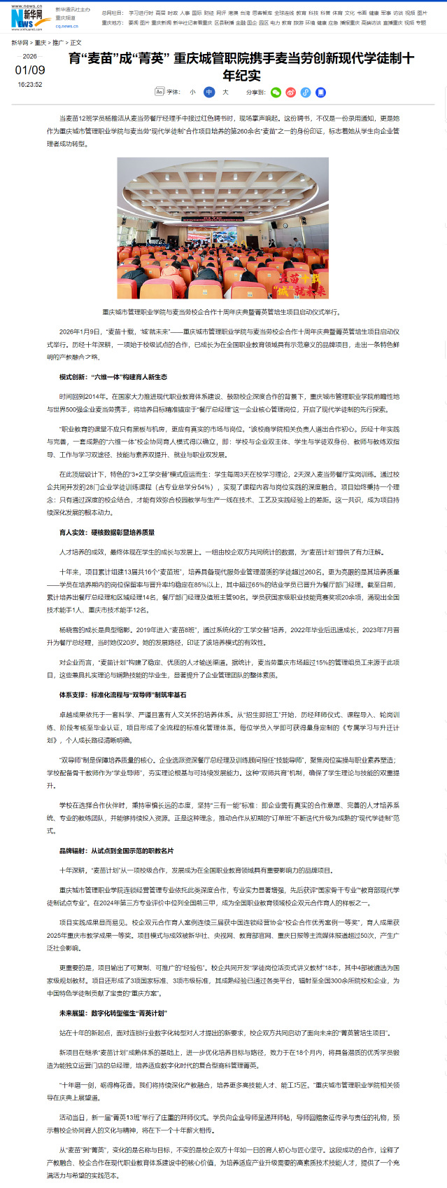 [新华网]育“麦苗”成“菁英” 重庆城管职院携手麦当劳创新现代学徒制十年纪实