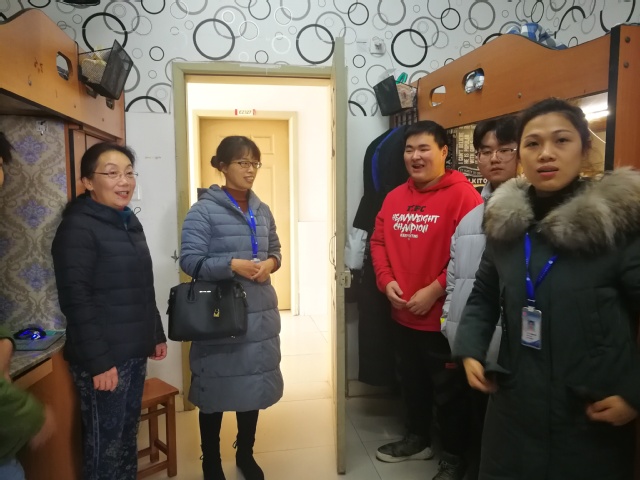为了进一步了解学生在校生活状况和学习状况,加强师生之间的沟通,促进学生宿舍管理,12月16日中午,我院党总支专职组织员青秋蓉,教师肖建英,辅导员龙婷与我院“四联系”老师——马克思主义学院姚红教授,走访我院康疗A1903、康疗A1904班学生宿舍。