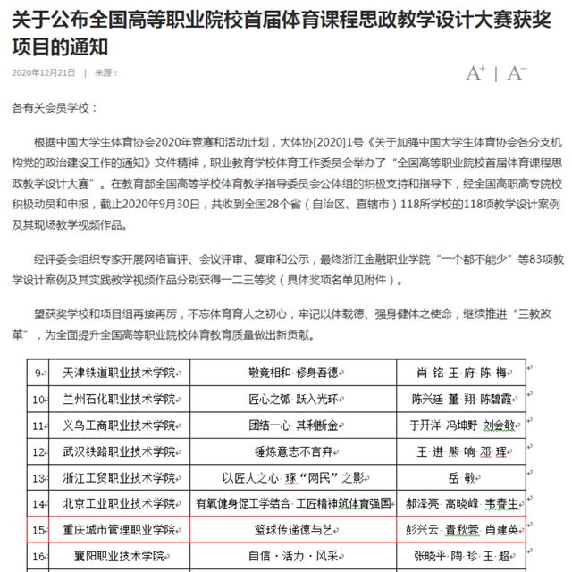 近日,由教育部全国高等学校体育教学指导委员会、中国大学生体育协会组织的全国高等职业院校首届体育课程思政教学设计大赛获奖项目名单公示,由智慧康养学院社体教研室主任彭兴云、专职组织员青秋蓉、实训教研室主任肖建英组成的三人教学团队的作品《篮球传递德与艺》喜获二等奖。