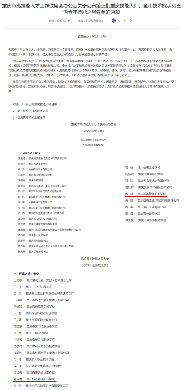 日前,重庆市高技能人才工作联席会办公室公布了第三批重庆技能大师、全市技术能收和巴渝青年技能之星名单,我院教师陶科荣获“重庆技能大师”称号、刘玉琳荣获“巴渝青年之星”称号。