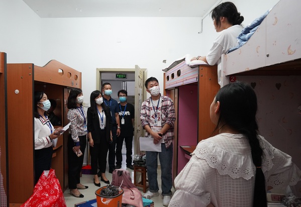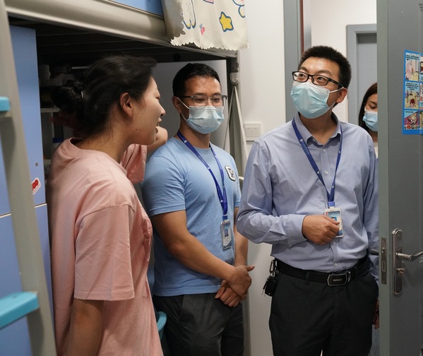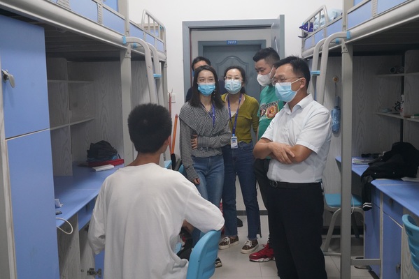 “同学,你是哪里人呢?”“晚饭吃了吗?学校的饭菜如何?”每到一处,张俊、田奇恒、雷靳灿都亲切地询问新生的生源地,对同学们的到来表示热烈欢迎和情切问候,并了解他们初来学校的感受,对学校的住宿、饮食等是否适应。在与学生的交谈中,张俊、田奇恒、雷靳灿希望大家尽快适应大学生活,做好规划,珍惜时光,力争收获新的成长。“最近天气变化快,温差较大,大家一定要注意适当增减衣物”“疫情期间,同学们进出要佩戴好口罩,要注意保护好自己”张俊、田奇恒、雷靳灿还提醒同学们在当前学校的疫情防控上不能有任何松懈,带好口罩、勤洗手、常通风,并及时关注群消息,配合做好每日健康打卡、核酸检测,若有体温异常等立即上报辅导员。