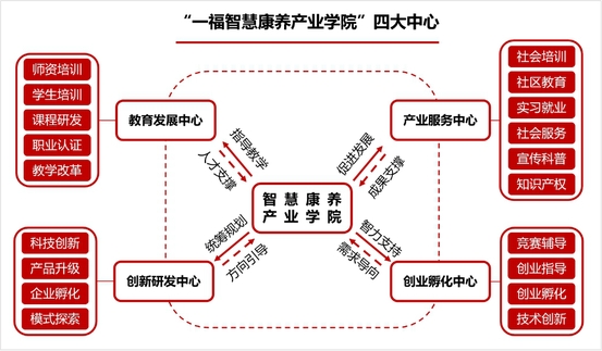 “智慧康养现代产业学院”围绕“四位一体”深度融合,构建四大中心增值赋能。产业学院以创建“教育发展中心”、“产业服务中心”、“创新研发中心”及“创业孵化中心”四大实体性运行中心,实现产学研用“四位一体”深度融合。