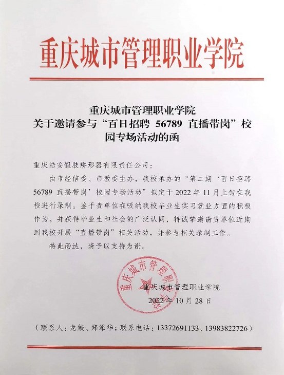 10月28日,学院还特别邀请了重庆浩安假肢矫形器有限公司、重庆康语启明康复服务有限公司,进校开展由市教委、市经信委主办的“百日招聘56789直播带岗位”录播活动。