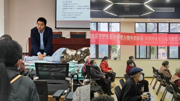 活动种,长期从事康复临床一线和教学一线的蒋宗伦副教授围绕偏瘫老年人良肢位的摆放、偏瘫老年人床上翻身法、合理选择拐杖和轮椅、家庭人员情绪管理四个主题展开讲座。他采用互动式、示范式、体验式的讲授方式,通过“理论知识+实际操作”有机结合的模式,深入浅出地讲明了科学护理方法在照顾失能失智老年人中的重要性、必要性,讲透了失能失智老年人护理中的要点、重点、关键点。青秋蓉老师结合目前老年人心理健康中普遍存在的问题,重点从提升失智失能老人及其照护者幸福力的角度进行了讲座,并根据大家提出的问题有针对性地进行解答,给予科学合理的康复建议,引导广大失能失智老年人家庭成员要调整心态,学会关心关爱自己的身体和心理健康,以更好的状态投入到失能失智老年人的照护中。活动赢得了失能失智老年人家属的赞誉,纷纷表示这次培训活动不仅是一场及时雨,也是一盏指路灯,为凭老观念、老经验、老办法护理失能失智老人而痛苦不堪的广大家庭提供了一次难得的学习交流机会,作为特殊群体,能够被党和政府、社会看见、关注、重视,学到了知识,舒缓了压力,这是非常幸福和高兴的事情,期待此类活动可以常态化长效化。