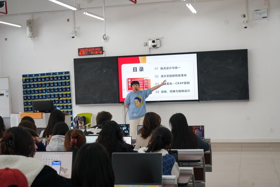 “现在的年轻人都讲究自己的穿衣风格,这种风格在我们PPT中也是有的。大家可以先感受一下这几种,简约、商务、科技、中国风、党政风,各式各样应有尽有。”李老师还就视演文稿的智能美化、CRAP原则、放映设计、配色用色原则等一一给同学们作了详细的讲解。并教授了PPT全文换肤、智能配色、制作动图等小技能。整个培训持续到下午17:30才结束。
