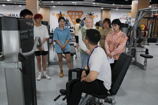 素质拓展开始,同学们首先来到有氧区,有氧区设有有氧单车、椭圆机和爬楼机等跑踏步类器械。社会体育专业师生志愿者为大家讲解了有氧运动的目的和原理,并结合健身房内的有氧器械逐一讲解规范动作要领及注意事项,向大家普及如何有效的科学健身。参训学生纷纷跃跃欲试,志愿者也帮助他们调试各自合适的力量强度和速度,给予不同人员给予针对性的指导。