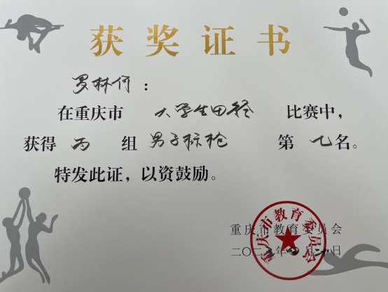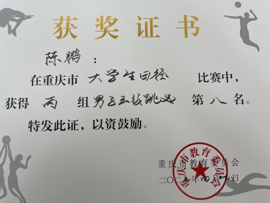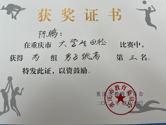在教练员黎丹、李京伟、周杰老师的带领下,我院社会体育专业9名学生首次组队参加体育专业组比赛。这次比赛体育专业组一共有18所学校参赛,其中包括西南政法大学、重庆大学、西南大学等本科院校和十来所专科院校,但是同学们顶住了压力,顽强拼搏。经过三天的激烈角逐,体育2022级陈鹏同学获得男子跳高第三名,三级跳远第八名,罗林何同学获得男子标枪第七名,2021级李文鹏被评为体育道德风尚奖先进个人。