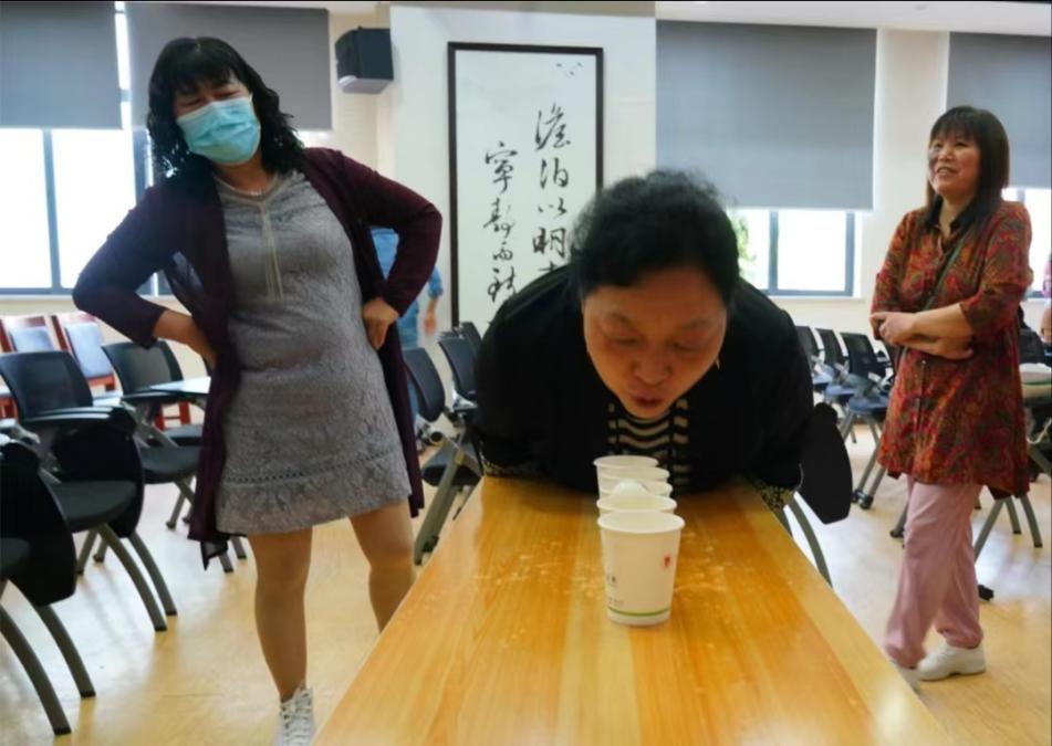 甩手操结束后,志愿者们邀请在场所有老人们来到旁边活动区玩起了《看看谁最快》(抽纸片)、《看看谁灵活》(夹五子棋)、《看看谁厉害》(吹乒乓球)小游戏。“李哥加油!哇,好霸道,四分!”,场上的“参赛选手”全力比拼,场下的“观众”呐喊助威忙个不停。“张姐,你该朝着这个右后方角度拉……你看,这样,一定要搞快!”经过比拼的阿姨们下场后,也不忘交流成功经验。“没得事,游戏娱乐嘛!下次就晓得技巧了!”看到没有发挥好的老人们,志愿者们送上了第一时间的安慰。单一步骤、简易道具的小游戏,老人们“你追我赶”地尽情玩耍着。不绝于耳的欢笑声,此起彼伏的欢呼声,叔叔阿姨们玩得不亦乐乎。通过这些小游戏,老人们手眼协调能力可以得到锻炼,手指的灵活度、嘴部肌肉的活跃度、肺活量的生理性能也在不经意的游戏动作中得以增强。