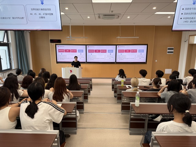 医学美容技术专业教研室主任陈霜露,从医美专业的介绍、人才培养模式、学习方法、就业路径,和世界技能大赛美容项目历年来所取得的成绩以及项目选手的选拔进行了阐述。