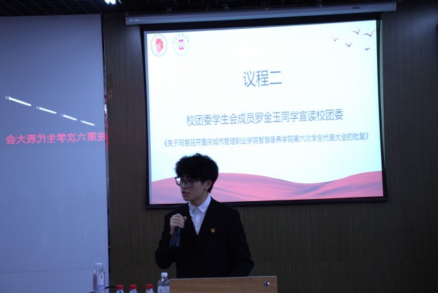 大会在庄严的国歌声中正式开幕。校团委学生会成员罗金玉同学首先宣读了《关于同意召开重庆城市管理职业学院智慧康养学院第六次学生代表大会的批复》,标志着会议程序的规范性与权威性。