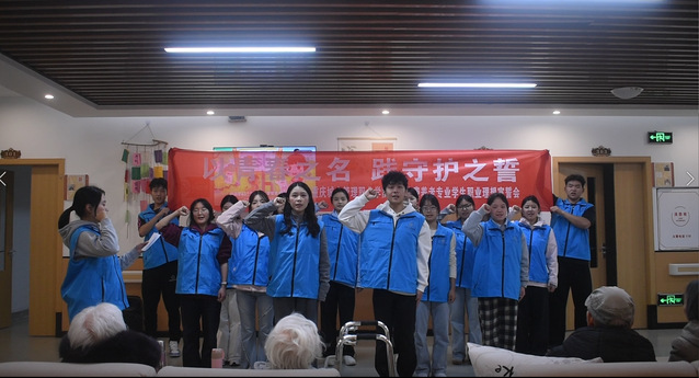 在“青春宣誓”环节。养老专业学生代表张君、陈宣衡等郑重承诺将积极投身老龄事业,以专业所学服务社会。老人们对志愿者的陪伴表示感谢,并期待常来,机构工作人员亦充分肯定了活动带来的活力与专业视角。