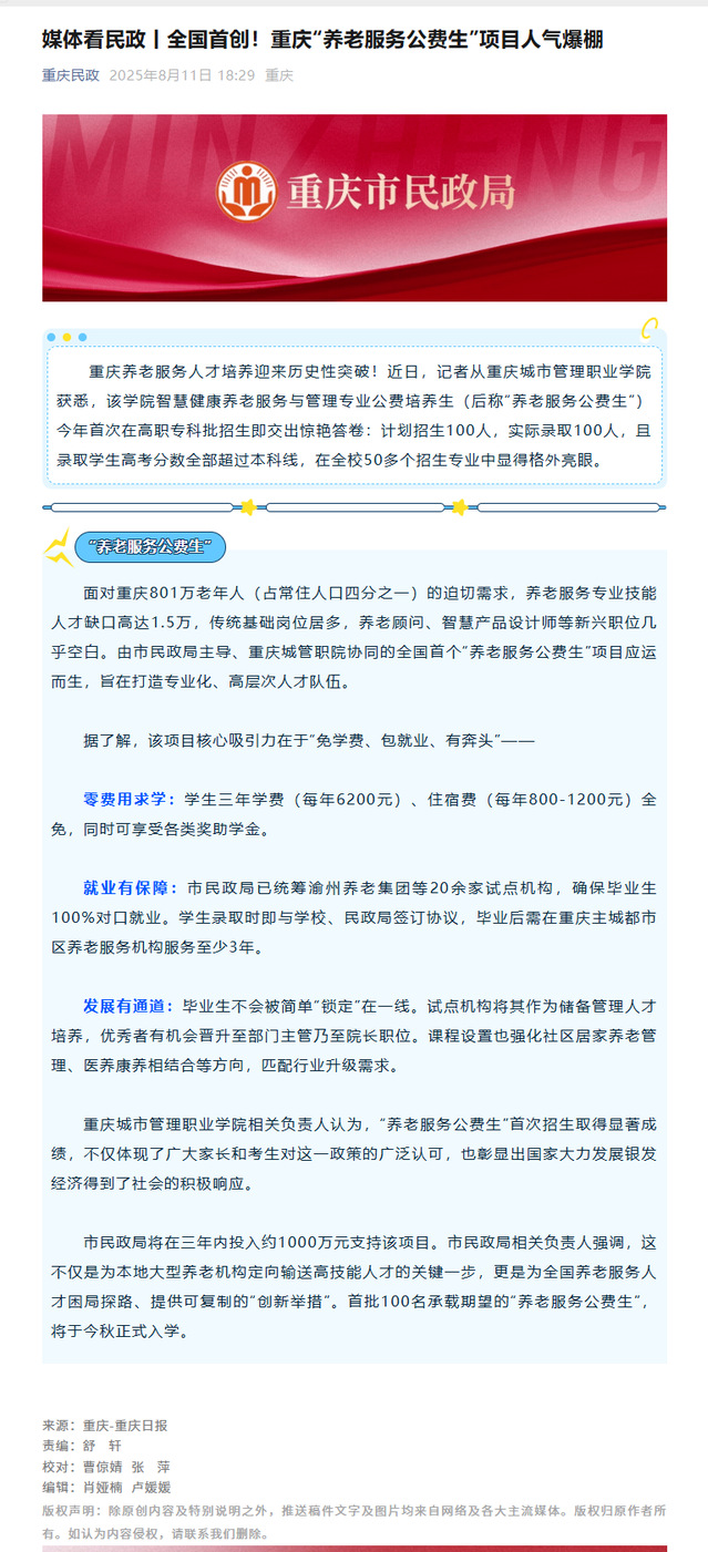 [重庆民政]媒体看民政丨全国首创!重庆“养老服务公费生”项目人气爆棚